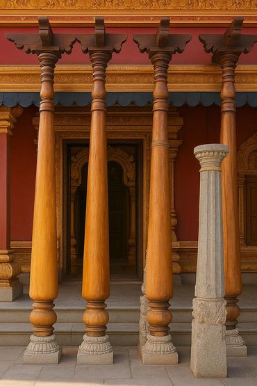 Antique chola style  tribhanga Parvati, the painted temple window, pillars, console & samovar